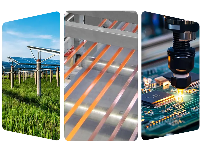 • สาขาไฟฟ้าโซลาร์เซลล์: การผลิตริบบอนและบัสบาร์เชื่อมไฟฟ้าโซลาร์เซลล์จำนวนมากเพื่อช่วยให้ส่วนประกอบนำไฟฟ้าได้อย่างมีประสิทธิภาพ
